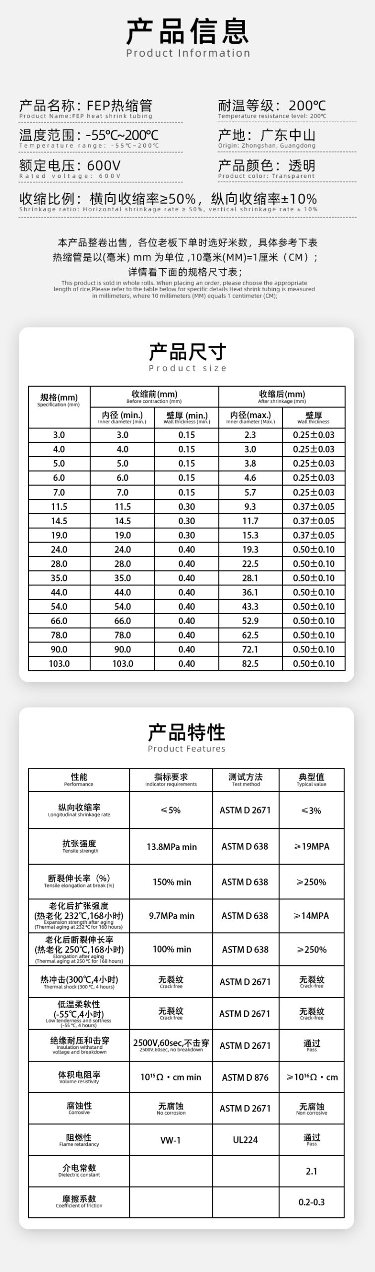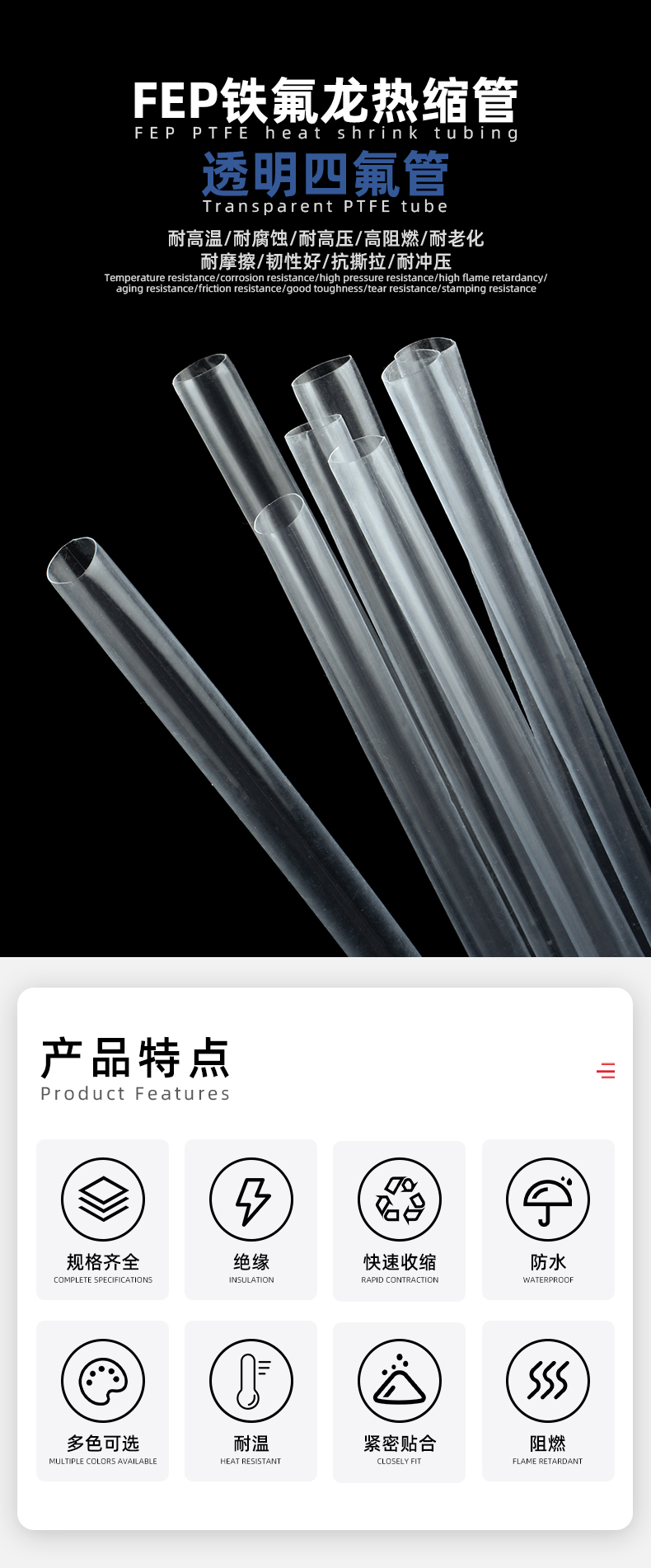 由聚全氟乙丙烯(FEP)材料制成,耐高温200℃、耐腐蚀、高绝缘、机械强度佳等特性,具有优异的耐磨性,透明度极佳。