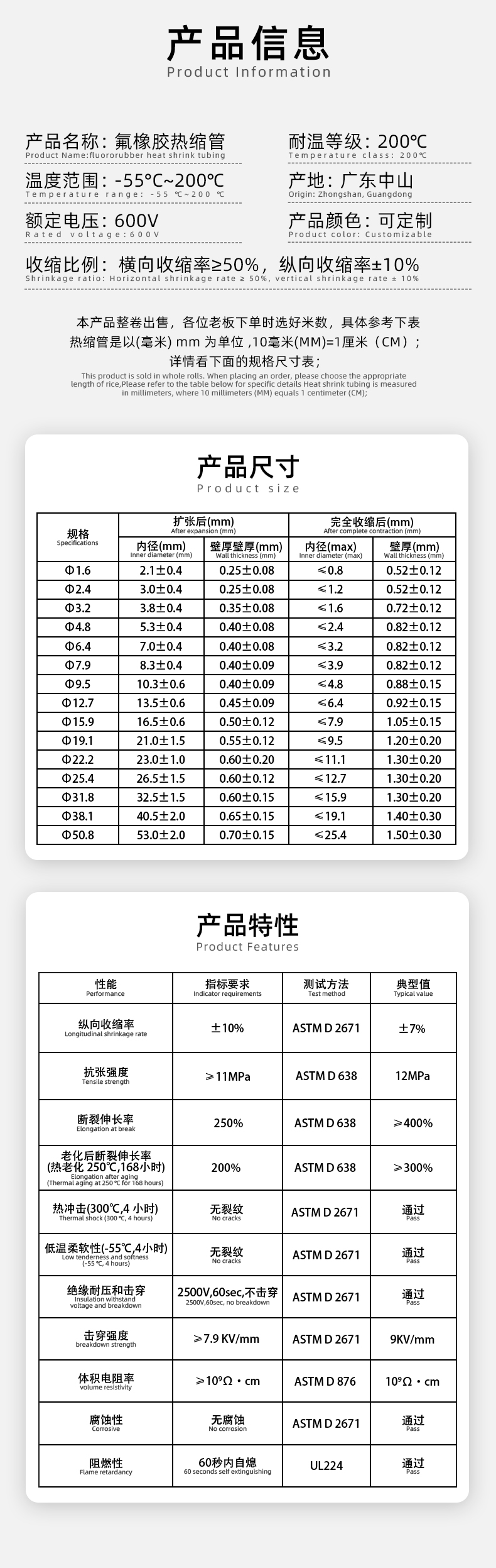 连续工作温度:-65~200; 起始收缩温度:150; 最低完全收缩温度:175