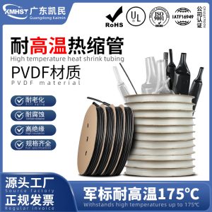 产品简介:由辐照交联特种含氟聚合物PVDF制成,具有优异的耐化学腐蚀和耐溶剂性能,是一种坚固、半硬、薄壁的热缩管,