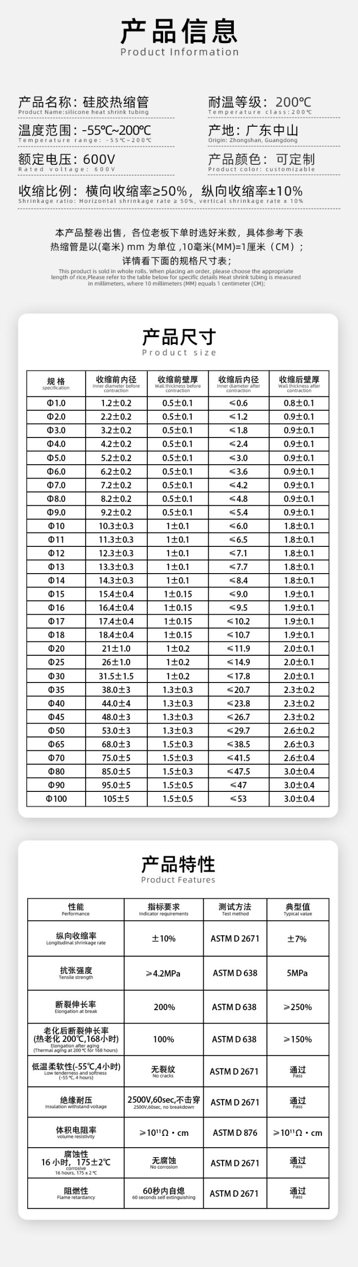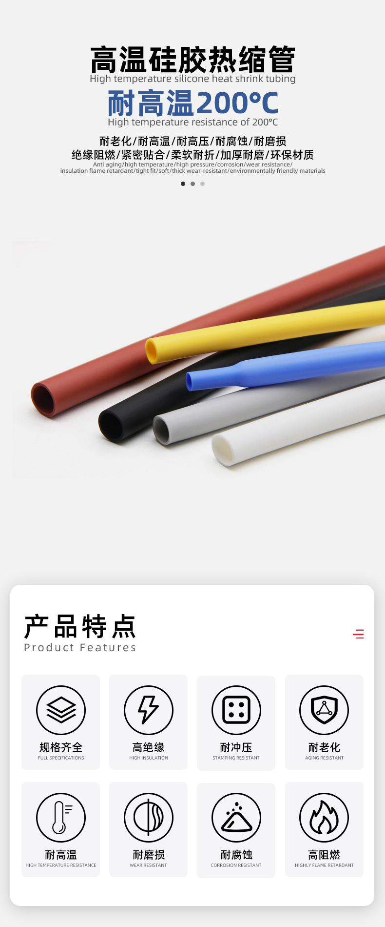 硅橡胶热缩管由硅橡胶经过化学改性制造而成,具有柔软弹性、耐高温、高绝缘性能等特性。热缩管加热时,套管内径迅速收缩,